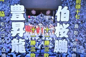 ・大相撲名古屋場所の千秋楽。11勝3敗で並んでいた、豊昇龍・北勝富士・伯桜鵬。まず北勝富士が勝つて12勝3敗。そして豊昇龍VS伯桜鵬(写真2)は、残念ながら伯桜鵬は負けて豊昇龍が12勝3敗。北勝富士との優勝決定戦は、豊昇龍が涙の優勝! 伯桜鵬は初入幕ながら11勝4敗にて、敢闘賞と技能賞をゲット!アッパレ~! 皆さん、応援ありがとうございました!
