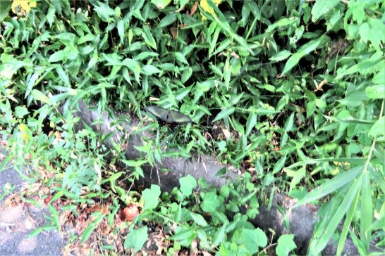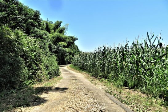 ・写真1、炎天の散歩道。右は飼料用トウモロコシ。2、ヒラヒラ飛んできた大きな黒っぽい蝶々(写真中央)。〔仕事と歩数〕センマガ「名句鑑賞」着手。6,126歩。