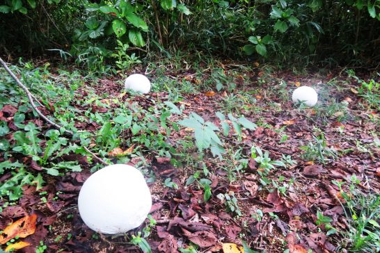 ・こんなところ生えているのはキノコの種類だろうが、初めて見るので何茸か知らない。スマホの検索に「白いボールのような茸」を入れてクリックしたら、直ぐにオニフスベと出てきた。白くて丸い写真も同じで、二つ割りにした写真も同じだったので間違いなし。大きなものは50センチにも達するとのこと。毒茸ではなく食べられるとのことだったが、とても食べる気はせず、触らぬ茸に祟りなし。そのままにして帰宅。