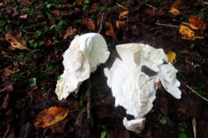 ・今日の夕刻散歩では小雨が降ってきたので、傘をさして総合公園の遊歩道をぶらぶら。テニスコートの外回りを歩いていたら、何やら白いボールのようなものが見える。バレーボールよりも小さいがソフトボールよりも大きい。直径20センチほど(私の指をいっぱい広げた位)。近づいて撮ったのが写真1。(クリックすると少し大きくなります)その横に誰かが踏み潰したのか二つに割れたのもあった(2)。中身も真っ白でマシュマロのような感じ(気持ち悪いので触らなかったが…)。