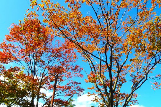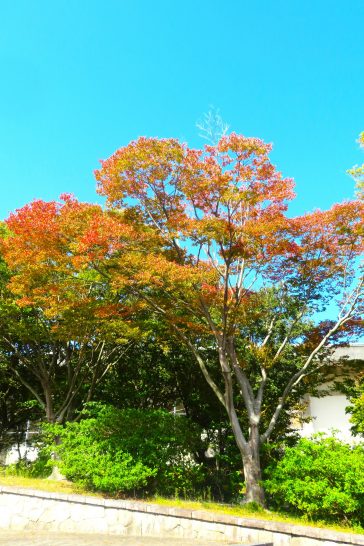 ・写真上2つとも昼前散歩の総合公園にて。まだ紅葉の時期には早いのだが、気の早いのが数本鮮やかな秋の彩を見せていた。