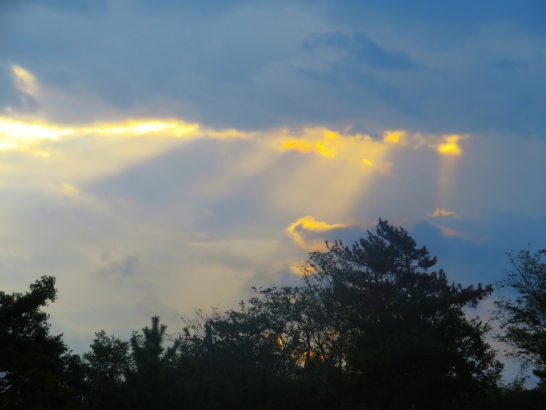 ・4時前に終了。真っすぐ帰宅して散歩に出ようと思っていたら夕立のような雨がバラバラ降ってきたので止め(すぐに止んだが)。写真は鳥取からの帰途。雲間からのサーチライト。〔仕事と歩数〕鳥取県大会へ出席。3,358歩。