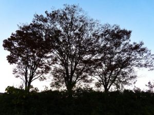 ・本日も快晴で初夏のような陽気。最高気温も25℃を超していたのではないか。昼前散歩も夕刻散歩もうっすら汗が出るほど。写真1、私の車(右奥)しかない総合公園駐車場。「はて?」と思ったら、「文化の日」だった。グランドでの行事もなかったらしい。2、夕刻散歩にて。立木のシルエット。〔仕事と歩数〕塔社常任理事会向け資料作成。6,736歩。