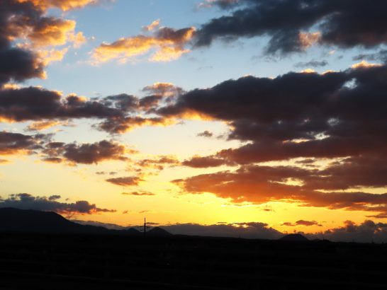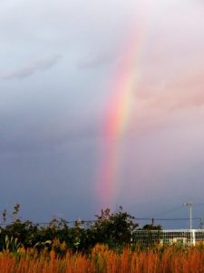 ・本日、朝から爽やかな秋晴れ。昼前散歩も快適だったが、夕刻になると雲が広がってきて、夕映えも写真1のように綺麗な模様だった。総合公園からの帰路に海側を見ると、灰色の雲が広がっている前に虹が出ていたので途中の空き地に駐車してパチリ(写真2)。〔仕事と歩数〕しんぶん赤旗「読者の文芸」選考。7,146歩。