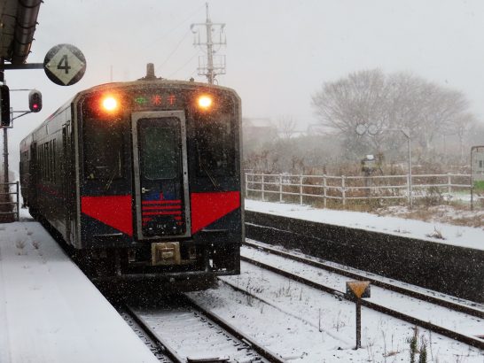 ・本日、第3木曜日にて、山陽カルチャー例会日。車で出かける予定だったが、朝から雪。加えて予報では「午後から警報級の豪雪になる恐れあり」などと言うので、安全第一で、急遽JRに変更。浦安駅8時19分発の米子行きに乗車。写真1は吹雪の中を浦安駅に入ってきた米子行きの普通列車。伯耆大山駅で「特急やくも10号」に乗り換え。岡山着は11時40分。たっぷり時間があるので、昼食後はちょっとした旅行気分で土産物店をぶらぶら、のち山陽新聞社8F着は定刻1時の10分前。