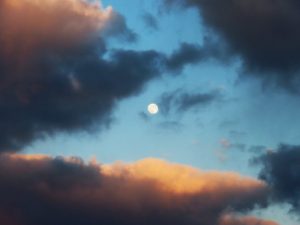 ・写真1、本日の午後4時30分頃、久しぶりの夕映え。2、東の空を見ると雲の間からお月さまが覗いていた。〔仕事と歩数〕塔社常任理事向け会議資料作成。6,587歩。