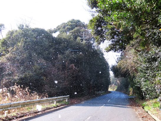 ・写真1、昼前散歩の農道にて。陽は差しているのに粉雪が舞っていた。冷たい風を避けて切り通しを歩く(写真2)。〔仕事&歩数〕川柳塔社向けの愛染帖・飛行船・各地柳壇などを見直してメール&投函。大山滝句座会報作成。7,163歩。