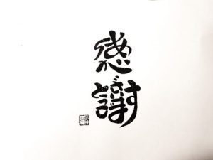 ・写真2の文字は、茶菓子を持ち帰るときに入れる紙袋の表に書いてある感謝ですが、他にも読み方があります。さて何と読めるでしょう?下に答えを反対から書いていますが、先ず見ないで考えてください。(クリックすると大きくなって読みやすいです)