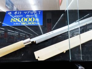 ・本日、第2土曜日にて倉吉の打吹川柳会例会日。早目に昼前散歩と昼食を済ませて12時20分に出発。会場の上灘コミュニティセンター着は定刻1時の5分前。句を出してから、近くのホームセンターへ買い物に出てぶらぶらしていたら刃物コーナーに出た。先日のテレビで外国人観光客が「高価な包丁を買っている」場面があったので、幾らぐらいするのかと思って眺めたら、ここでいちばん高かったのは、写真2のマグロ包丁で税込み96,800円。2番目に高かったのは写真3の出刃包丁で税込み83,600円。テレビで紹介していた専門店のは30万だったか?40万だったか?メチャ高かった。やはりホームセンターではこの程度が限度なのだろう。