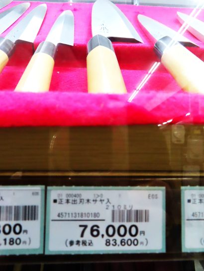 ・本日、第2土曜日にて倉吉の打吹川柳会例会日。早目に昼前散歩と昼食を済ませて12時20分に出発。会場の上灘コミュニティセンター着は定刻1時の5分前。句を出してから、近くのホームセンターへ買い物に出てぶらぶらしていたら刃物コーナーに出た。先日のテレビで外国人観光客が「高価な包丁を買っている」場面があったので、幾らぐらいするのかと思って眺めたら、ここでいちばん高かったのは、写真2のマグロ包丁で税込み96,800円。2番目に高かったのは写真3の出刃包丁で税込み83,600円。テレビで紹介していた専門店のは30万だったか?40万だったか?メチャ高かった。やはりホームセンターではこの程度が限度なのだろう。