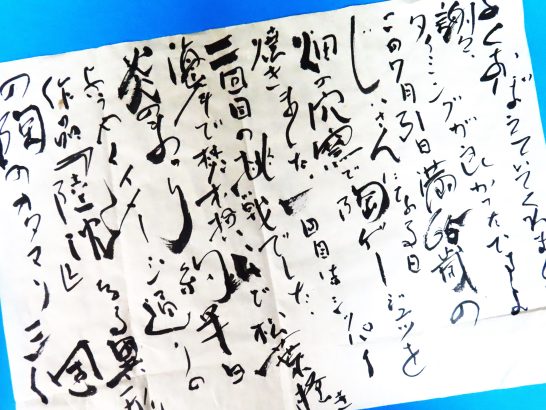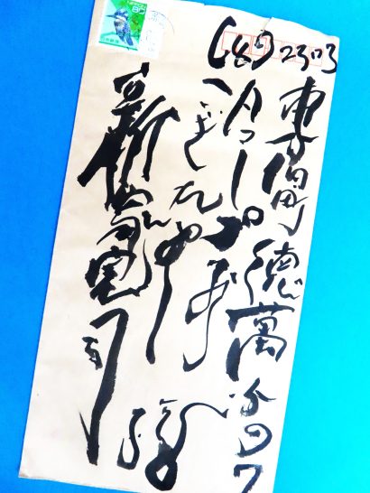 ・本日、少し時間が余ったので、机の上や引き出しの中を整理していたら、どこからか出てきた1通の封書(写真2)。見ただけで石花菜さんの字だと分かる。が、この宛名でよく届いたなと思うぐらい個性が溢れて自由奔放! まあ、郵便番号は辛うじて読み取れ、屋号の「こぎれや」と「新家」も辛うじて読み取れるので届いたのだろう。いつ頃の?と思って調べたが、消印は読み取れず、ただ、便箋(写真3)の文面に「この7月31日満65歳のじいさんに…」と書かれているので20年以上も前のことになる。この便箋は3枚あって、ゆっくり読めばほぼ解読できる。