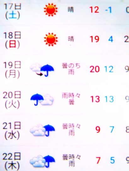 だが、今日はいずれの地方も12℃ほど下がって最高気温は8~9℃。こちら鳥取も昨日の最高気温は20℃。そして本日は8℃。この寒暖差はまだまだ続いて、写真上は鳥取市の週間予報だが、明日(17日)と明後日(18日)はで気温も19℃、19日には20℃の予報。だが、22日にはガクンと下がって7℃の予報。皆さまくれぐれもご注意ください。〔仕事&歩数〕各書状へ返信。大山滝句座「前号再見」。7,396歩。