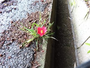 椿、あまり人が通らない道なので、全く偶然の、自然のいたずらです。面白いですね。