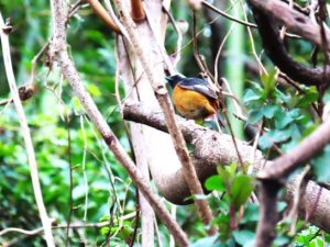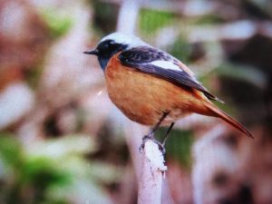 ・野鳥の名前もほとんど知らないので、帰宅してネットで「春の野鳥図鑑」を見たら、「腹がオレンジ色はジョウビタキの雄」という説明と一緒に写真が出てきた(写真3)。鳴き声も出てきたが、「ヒッ ヒッ!」という感じ。散歩コースではたくさんの鳥の声が聞こえるので、聞いたことがあるかどうか?不明。