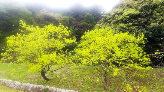 ・写真1、昼前散歩の総合公園にて。手前はふかふかに積もった落ち葉。向こうに薄緑で見えるのは芽生えた草。2、同じ総合公園の柿若葉。曇天でも眩しく輝いていた。