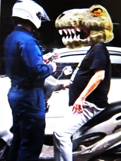 ・写真3、2日ほど前に杜青春さんからメールで送って頂いていた台湾川柳会会報に載っていた「交通違反で捕まった恐竜」。バイクに跨った恐竜の腹が出ているのと、上目遣いの顔が愉快で笑ってしまった。