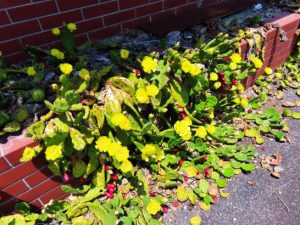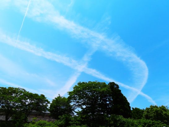 ・写真1、昼前散歩にて。上空には飛行機雲が面白い模様を作っていた。2,駐車場横にある元スナックの植え込みのサボテン。冬から春先までは元気なく、地面まで伸び切ってペタンと死んだようになっていたが、今日見ると少し元気になって、黄色い花が咲いていた。〔仕事&歩数〕愛染帖PCインプット。山陽カルチャー段取り。6,357歩。