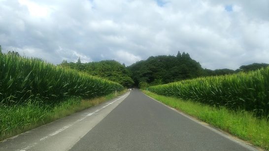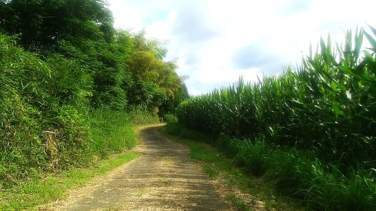・写真1~2、朝散歩の農道と農道の脇道にて。いずれも飼料用トウモロコシがすくすく育って背丈を超えていた。〔仕事&歩数〕川柳葦群「葦群抄鑑賞」。5,372歩。
