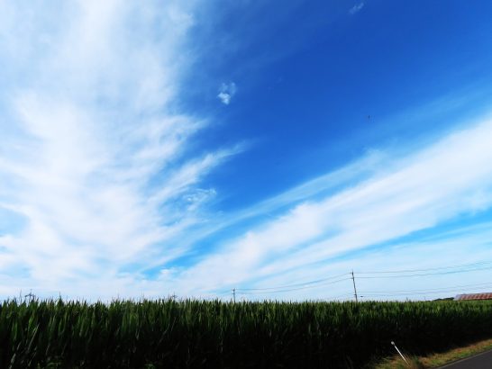 ・本日の最高気温は33℃。昼前散歩が出来なかったので、倉吉句会で投句を済ませてから、近くの小鴨川の河原をブラブラ散歩。写真1は小鴨川の清流と夏雲。ここでは2,500歩ほどだったので、帰宅してから総合公園へ。遊歩道を頑張って歩いた。空には飛行機雲が流れたのか綺麗な雲(2)。〔仕事&歩数〕倉吉川柳会向け作句&出席。6,544歩。
