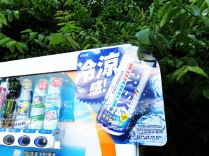 ・本日も最高気温36℃の猛暑日。昼前散歩では濡れタオルを首に巻いて、総合公園外周の農道をアバウト3,000歩。駐車場に戻ってきたときは汗びっしょり。喉が渇いたので、自販機へ。フト見ると自販機右上に何やら宣伝写真が貼り付けてある(写真2)。新製品?今まで見たことがない?ような。だが「冷涼」という文字が目について「試してみよう」とディスプレーを眺めたら、いちばん下の右端で「200円」。この自販機でいちばん高いが「ストレスや疲労感を軽減」とあるので「今の俺にピッタリ!」と購入。