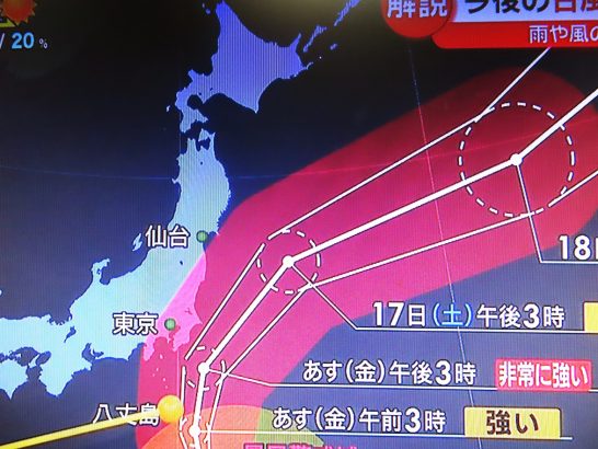 ・明日の午後3時ごろ、非常に強い勢力の台風7号が関東方面に最接近(房総半島)する模様で、暴風のみならず集中豪雨が予想されています(写真1~2)。列車や飛行機そして船舶などの運航中止が告げられています。また、さまざまの行事やライブなどが中止や延期になっているようですが、進行方向の皆さまくれぐれもご注意ください!