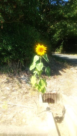 おはようございます。いっぱい咲いているヒマワリは見慣れていますが、1本だけポツンと咲いているのは初めてだったのでチョッとビックリしました。しかも、排水溝のすぐ横で、健気に咲いていました。
