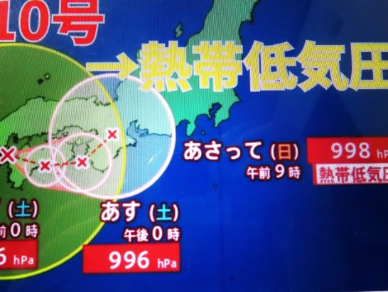 ・強力な台風10号はゆっくりと東に向かって、これからは四国の下の方を狙っているようですが、1日(日)頃には熱帯低気圧に変わるという予報も出ています(写真3)。 台風と熱帯低気圧の違いは風速とのこと。風速が17・2m/S以下になると熱帯低気圧と呼ぶとのことです(17・2m/S以上は台風)。風のパワーが少し低下するようで、その点はチョッと安心ですが、雨量などは不明ですので、まだまだご用心ください。