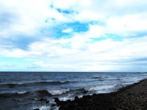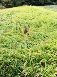 ・写真1、夕刻散歩に出かけようとしたら、海の方が明るくなって青空が見えたので、総合公園に出かける途中に海岸へ立ち寄ってパチリ。青空は頼もしかったが海の色は、河川からの土砂流入の所為か茶色く濁っていた。2、公園横の田圃の稲が強風にあおられて三分の一ほど倒れていた。〔仕事&歩数〕大山滝句座互選表作成。7,193歩。