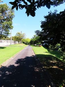 ・今日も昼間の最高気温は34℃ぐらいあったようで、歩いているとジットリ蒸し暑かった。ところが木陰に入ると急に涼しくなって爽やかな風。思わず立ち止まって、その強い日差しと木陰の落差をパチリ(写真2)
