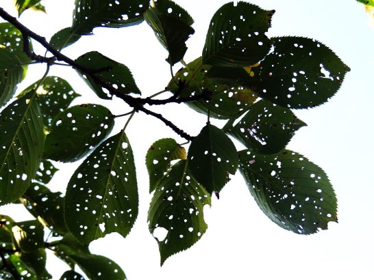 ・今日、散歩していてフト気がついたこと。桜の葉っぱがいっぱい虫に喰われている(写真1)。特にたくさん喰われているものを選んで撮ったのだが、他の葉っぱも無傷のものはないほどいっぱい喰われている。帰宅してからネットで「桜の葉が好きな虫」で検索したら、いろいろな虫が好んで食べているよう。興味のある方は調べてください。