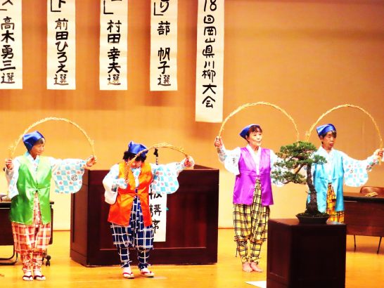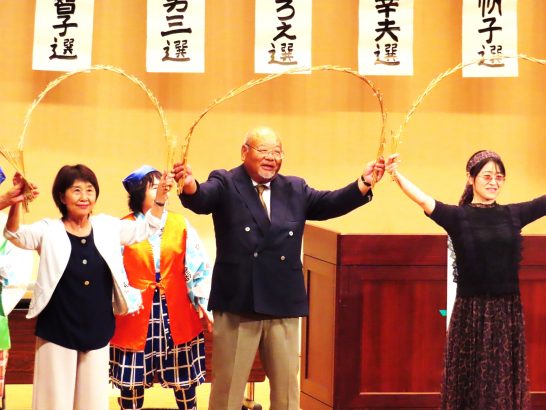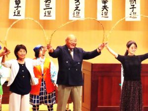 写真は投句後の昼休み余興の「南京玉すだれ」は指名されて舞台に上がって、初めてチャレンジした実行委員会会長並びにメンバー。見事に成功して拍手喝采👏