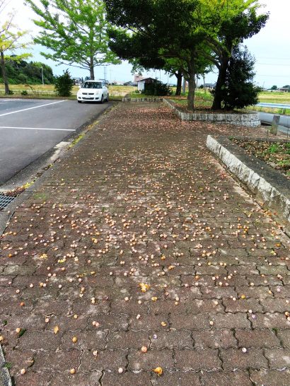 ・鹿野からの帰途には雨が止んでいたので、帰宅して散歩。目標の5,000歩まで頑張る。ここ数日の雨の所為か総合公園の駐車場横にはギンナンがいっぱい落ちていた(上)。〔仕事&歩数〕鹿野向け作句&出席。5,351歩。