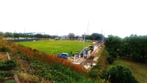 ・写真1、昼前散歩も小雨だったので総合公園の樹木が雨除けになっているいつもの遊歩道を歩く。2、小雨の中でもサッカー場では防球ネット用のポールを立てる工事をしていた(クリックで大きくなります)。〔仕事&歩数〕鹿野ジュニア川柳選考。6,257歩。