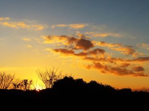 ・本日の予報では☁のち☔だったが、ずっと雨は降らずに夕刻には好天になって綺麗な夕映えだった(写真2)。写真1は昼前散歩での東の空。南の方には雲が多かったが次第に晴れてきた。〔仕事&歩数〕大山滝句座互選資料作成。塔社向け作句。7,185歩。