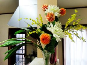 写真、本日の夕刻散歩での夕映え。、昨日頂戴した花。花瓶2つを使って家内が活けたが、まだ余っていたので隣家の奥さまに進呈して喜んで頂いたとのこと。〔仕事&歩数〕愛染帖選考・PCインプット。7,355歩。