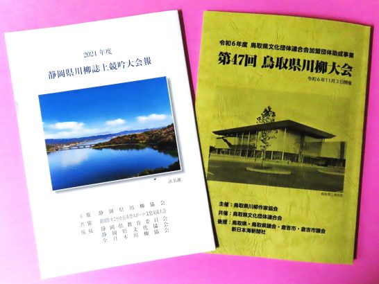 ・本日、昼前に【2024年度 静岡県川柳誌上競吟大会】の発表誌が到着(写真3の左)。開くと「入賞おめでとうございます」という挨拶文と景品の図書カードが入っていた。内容を確認すると、点数6点ということで、5位から12位までの8人が6点だった。私の入選句は下記の4句だが、〇印が共選の2名から選ばれていて選者1人の佳作になっていたので、この佳作が2点なのだろう。