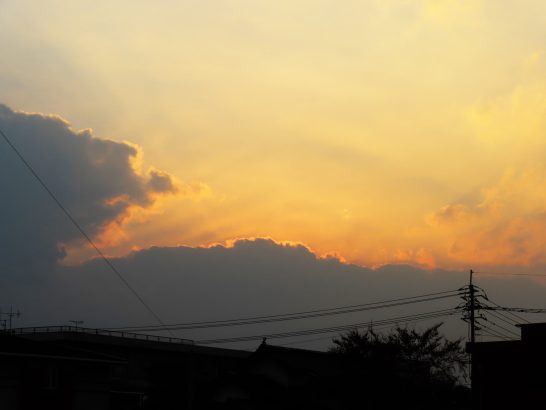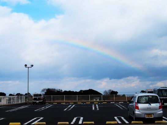 ・写真1、昼前散歩の前にマーケットに寄ったら、海の方向に虹が見えたのでパチリ。2,夕刻散歩から帰った駐車場から西を観たところ。太陽は雲の下に隠れて夕映えの光芒だけ。〔仕事&歩数〕センマガ向け「名句鑑賞」。7,821歩。