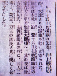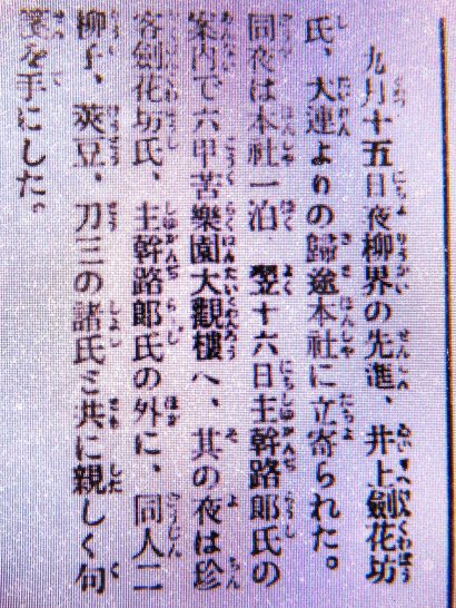 ・電子化されたこの川柳雑誌第21号の10ページに「剣花坊来たる」と題した記事あり(3)。このままでは読みにくいので書き直すと【九月十五日夜柳界の先進、井上剣花坊氏、大連よりの帰途本社に立ち寄られた。同夜は本社一泊、翌十六日主幹路郎氏の案内で六甲苦楽園大観楼へ、その夜は珍客剣花坊氏、主幹路郎氏の他に、同人二柳子、莢豆、刀三の諸氏と共に親しく句箋を手にした。】