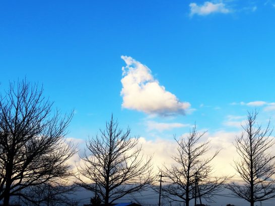 ・写真1、夕刻散歩にて。面白い雲。2、駐車場の車の傍に止まっていた鳥。。窓を開けると逃げるので窓ガラス越しにパチリ。〔仕事&歩数〕大山滝互選表作成。7,439歩。