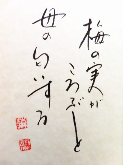 「梅の実がころぶと母の匂いする」この色紙のほかに二つ持っています、先生にはいろいろお世話になりました。本当にありがとうございました、ありがとうございました。