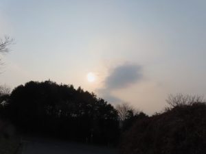 ・昨日の午後から、遠くの山が少し霞んでいたので「黄砂か?」と思って、ネットで気象庁の黄砂飛来情報を見たが「鳥取県=ほぼ無し」だった。今朝、屋外に置いている車のフロントガラスにうっすら埃のようなものがあった。これは黄砂ではないか? また、本日の夕刻散歩でも夕陽が霞んでいた(写真2)。やっぱり黄砂だと思って、また気象庁のサイトを開いたが「ほぼ無し」。これは黄砂ではなく春霞なのか? 写真1は昼前散歩にて。冬の枝。〔仕事&歩数〕大山滝句座作成。発送段取り&発送。7,829歩。