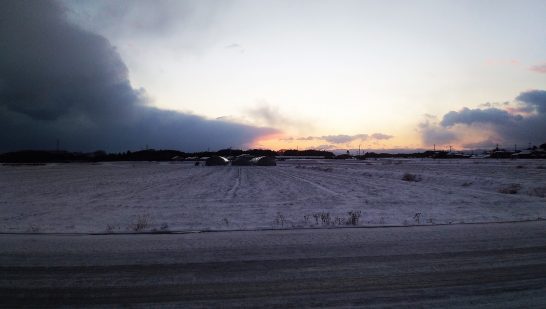 ・本日、第1水曜日にて医光寺坐禅会例会日。雪が心配だったのでいつもより少し早めに、5時前起床~5時10分出発。圧雪はあったが車が走った跡は減っているのでスイスイ。上郷谷に入ると除雪車が走っていたので楽勝。5時半より開始。本日の参禅者6名とお寺さん。終了後本堂で般若心経声明。のちミニ法話を頂戴。のち別室で朝粥を頂戴しながら談笑。7時前に辞去して帰るときには東の空が明るくなっていた(写真1)。帰宅して2階の窓から拙宅前の道路と、農協前の駐車場をパチリ(写真2)。積雪はこの程度。
