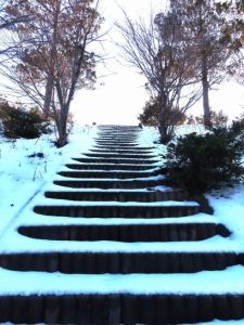 ・写真2は夕刻散歩にて。長靴で総合公園の遊歩道を歩いて途中の石段を下からパチリ。3は公園遊歩道の雪の状況。長靴の跡が残っているがまだ溶けてはいない。4は外周の農道にて。山影の場所はこの程度の雪。〔仕事&歩数〕句集鑑賞。5,218歩。