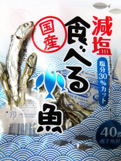 ・写真1の「食べる小魚」とは、出汁用のジャコではなくて、このままオヤツやオツマミで食べても美味しいですよ、という意味。入っている小魚はカタクチイワシ。私はもっぱら焼酎のツマミで食べているが、昨日、袋の底の方で見つけたのが、左に並べた真ん中のデカいの。大きさ比較で普通サイズのを並べてみたが、倍ぐらい(重さだったら3倍ぐらい?)ある。これは今夜のツマミで頂戴する予定。