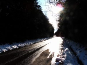 ・今シーズン最大の寒波もようやく去ってホッとひといき。最高気温はまだ5℃止まりだったが青空が出て快適だった(写真1)。夕刻散歩では風が冷たくなってきたので、両側が林になっている坂道を歩いたら、路面の濡れたところが逆光で輝いていた(2)。散歩から帰る途中の踏切で信号待ちをしていたら、西から驀進してきたのは鳥取行きの特急「スーパーまつかぜ」だった(3)。〔仕事&歩数〕川柳展望向け「句集鑑賞」「会員作品評」等々を再チェック後メール送稿&投函。6,645歩。
