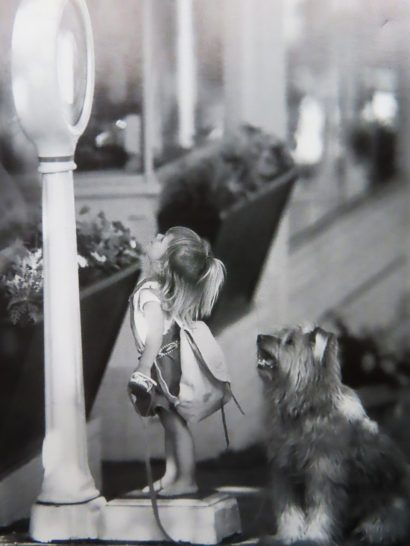 ・お嬢ちゃんとワンちゃんの会話。「また太ったみたい~~👧」「リュックを降ろした方がいいと思うけど…🐶」