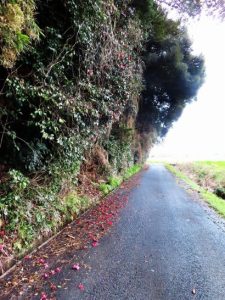 ・写真1、本日昼前散歩にて。風が冷たかったので、いつもの切り通しを行く。2、農道の脇道では椿の落花が鮮やか。夕刻散歩では青空が出て「明日から良い天気ですよ」と言っていた。〔仕事&歩数〕川柳塔社「愛染帖」選考&PCインプット。7,016歩。