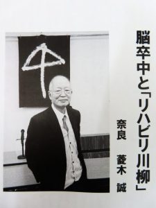 菱木 誠さんから「脳卒中とリハビリ川柳」という10ページの冊子(写真)を頂戴した。内容は脳卒中で倒れて緊急搬送、そして手術とその後のリハビリを通じて、考えたことや感じたことを述べ、そこから生まれた川柳を間に挟んでいる。その【はじめに】には、次の通りに記さている【この拙文は、脳卒中で倒れ、片足半分を棺桶に突っ込み、奇跡的に社会復帰した5か月11日のレポートである。厳しいリハビリの中で川柳を詠み、救われて来た記録でもある(後略)