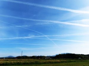 ・3時10分頃に終了。真っ直ぐ帰って、夕刻散歩のため総合公園へ向かっていたら、上空に飛行機雲がたくさんクロスしていた(3)。飛行機雲がなかなか消えないのは、上空の湿度が高い所為で、天候が崩れる予兆とのこと。そういえば明日の予報は☁のち☂になっている。〔仕事&歩数〕岩美川柳会出席。7,273歩。