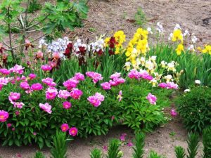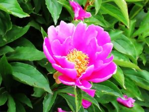 写真、夕刻散歩にて。永遠の単線JR山陰本線、散歩道の下に見えた菜園の隅の花畑。、その中でも鮮やかだった花。牡丹と思ったがネットで葉を調べたら芍薬かも?〔仕事&歩数〕塔社常任理事会向け書類。7,758歩。